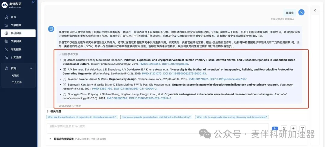 3、自动推荐话题相关文献 除了回答问题,MaltSci 还会自动推荐与对话主题相关的文献,帮助你快速扩展阅读范围,获得更多科研灵感。
