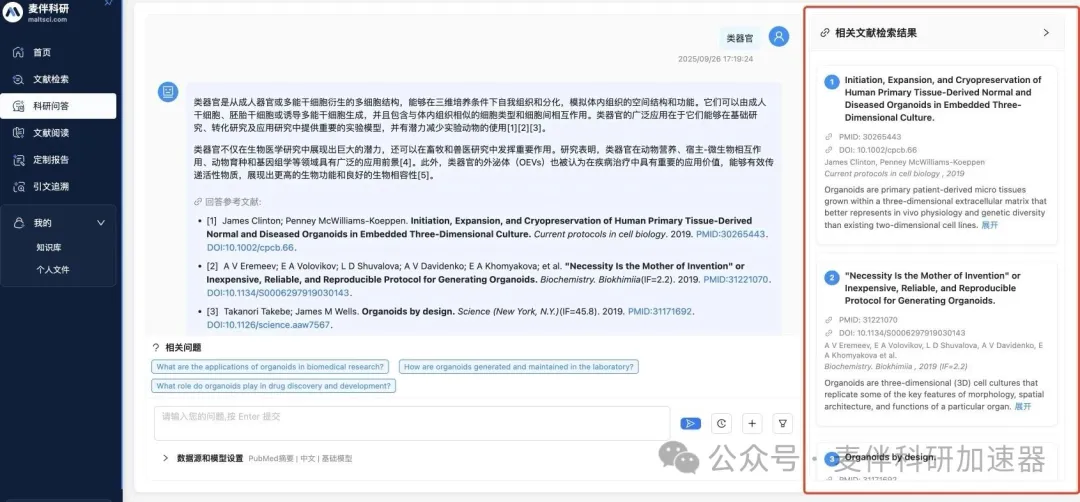这意味着什么? 不再是“漫无目的的检索”,而是即时获得高质量答案+真实文献支撑+延伸阅读建议。科研效率成倍提升,查文献不再是负担,而是源源不断的灵感来源。