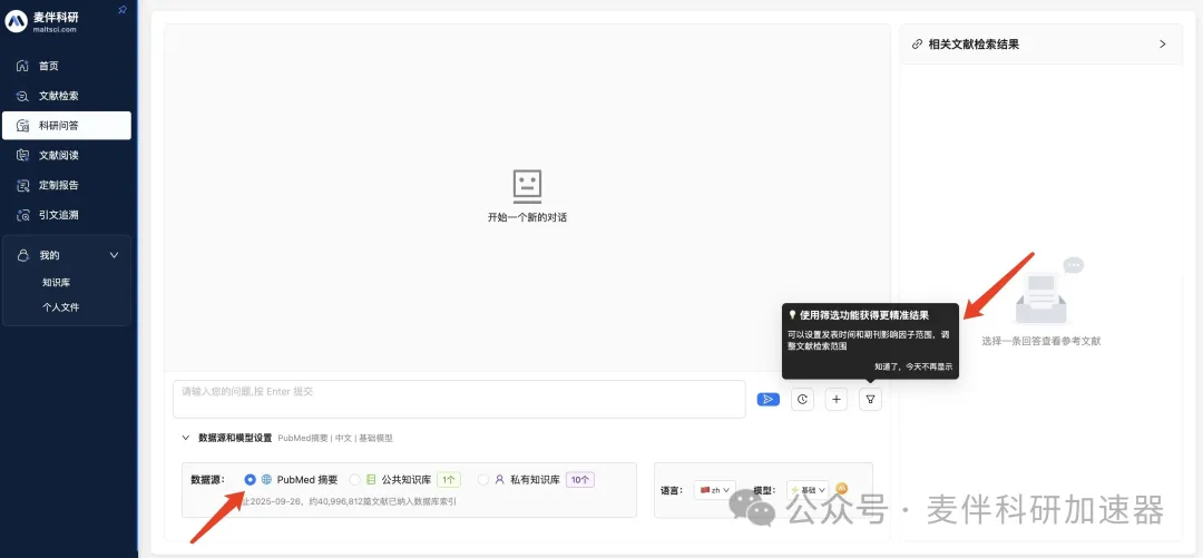 为什么说它“包爽”? 1、全量覆盖 + 个性化定制 MaltSci 基于近 5000 万条 PubMed 文献摘要进行对话,并支持定制筛选,比如限定发表时间、期刊影响因子,甚至可以直接使用你自己上传的文献知识库,让对话更贴近你的研究方向。