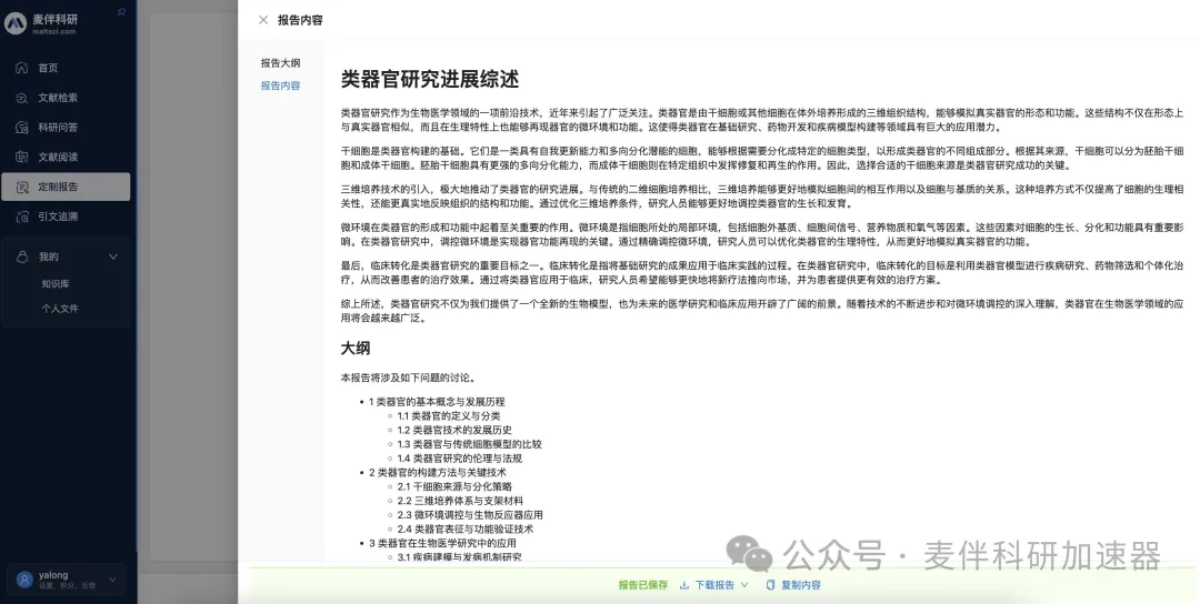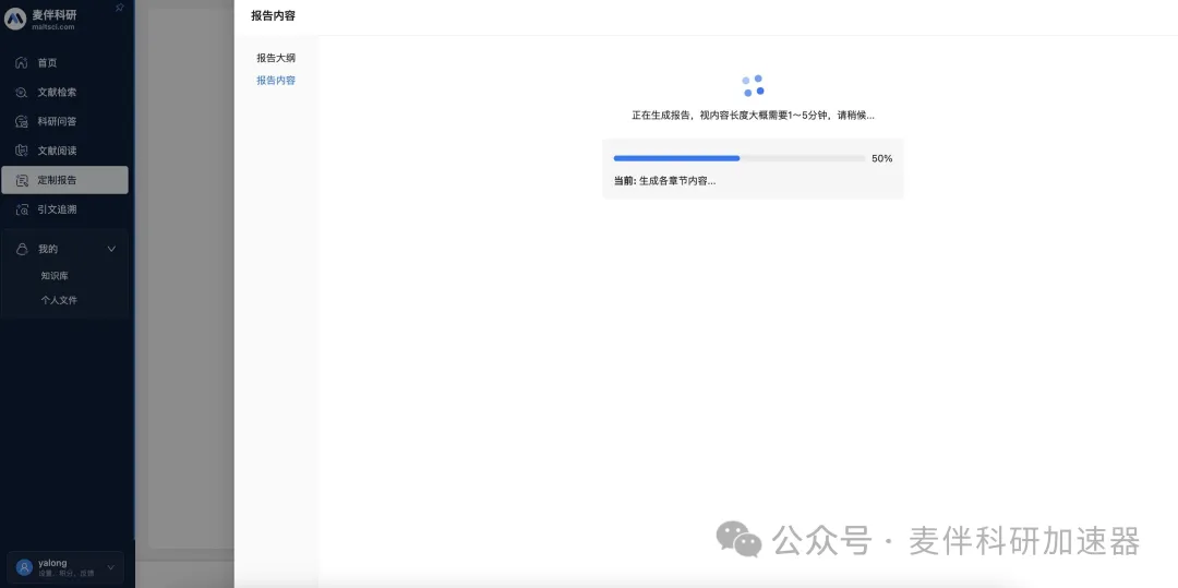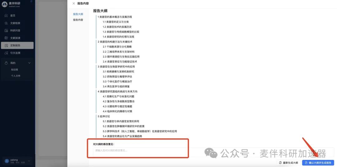 如果确认大纲无误,可以点击“确认大纲并生成报告”进入报告生成。