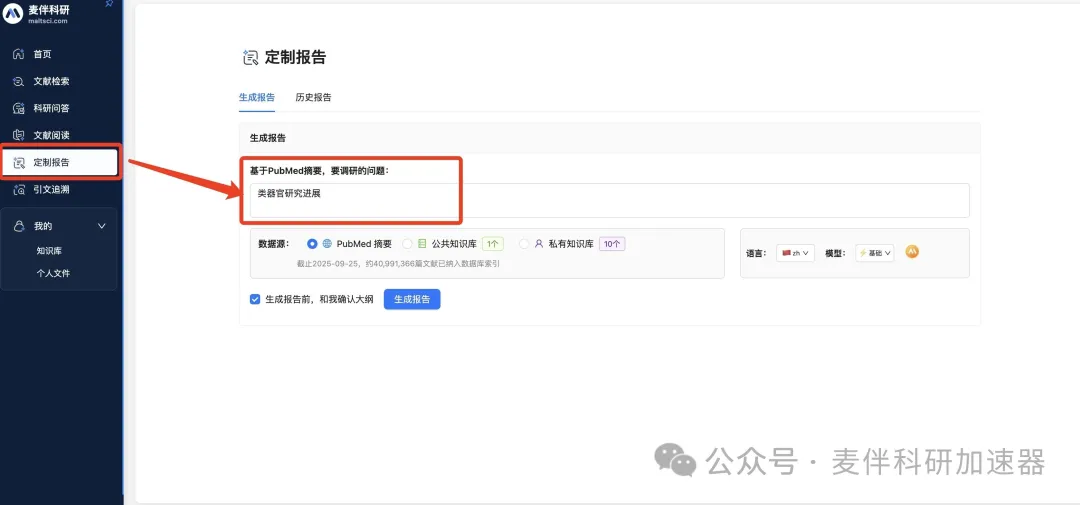 Step 1:通过 MaltSci 的定制报告输入想要调研的主题 打开 MaltSci 的定制报告功能,在生成报告页输入想要调研的主题,可以是一句话也可以是一个词。
